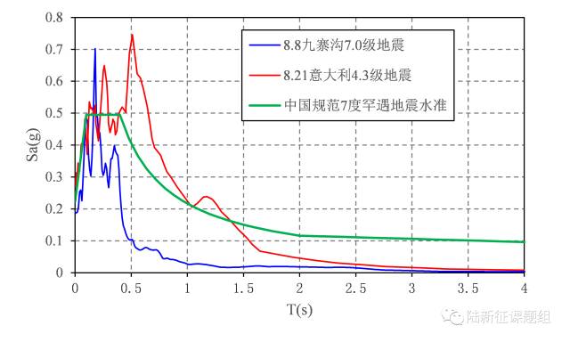 圖4 8.8九寨溝7.0級地震和8.21意大利4.3級地震震中附近反應譜對比