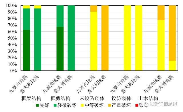 圖5 采用城市抗震彈塑性分析方法對比8.8九寨溝7.0級地震和8.21意大利4.3級地震震中附近鄉鎮建筑物破壞