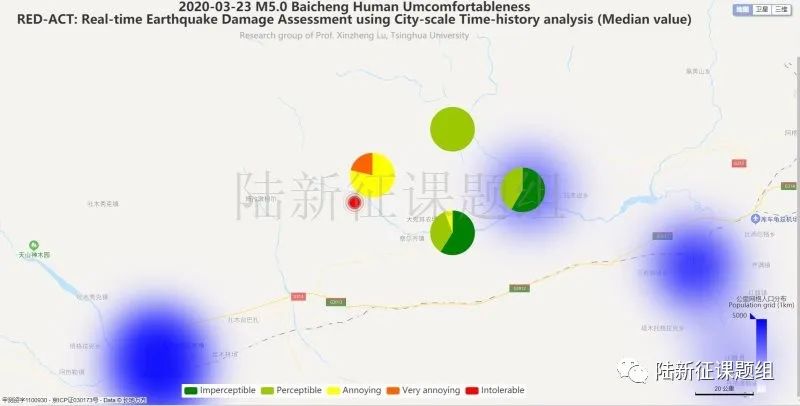 圖420200323新疆阿克蘇地區(qū)拜城縣5.0級地震不同臺站地震記錄人員加速度感受分布圖