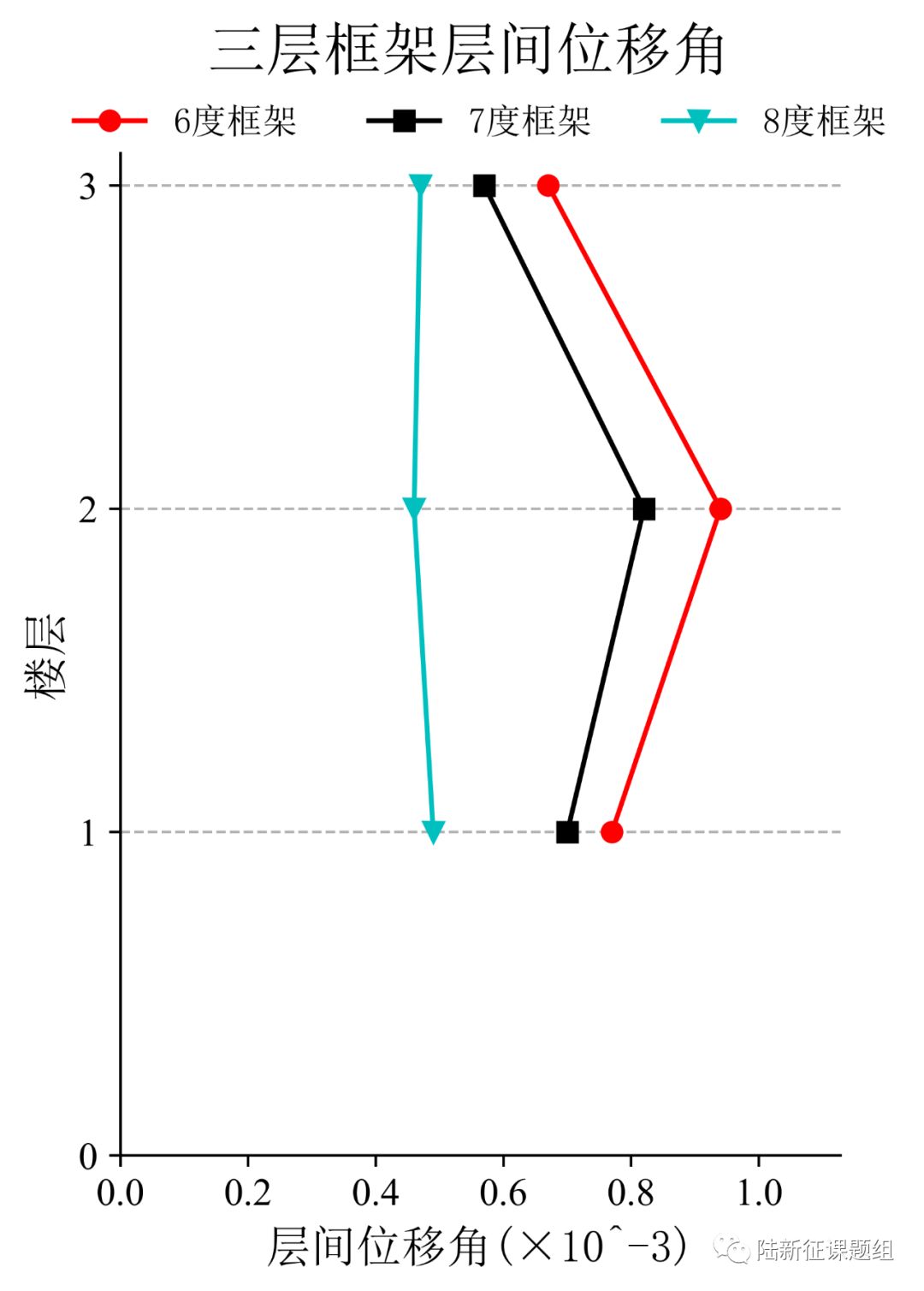 將65LHT臺站記錄輸入立面布置如圖6 (a)所示的6度、7度和8度設(shè)防的典型三層鋼筋混凝土框架結(jié)構(gòu),得到其層間位移角包絡(luò)如圖6 (b)所示。