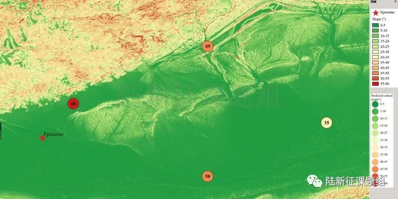 根據(jù)當(dāng)?shù)氐匦螖?shù)據(jù)、巖性數(shù)據(jù)和實(shí)測地面運(yùn)動記錄,可以計算得到不同滑坡體飽和比例下的滑坡分布,如圖5所示。其中,底圖為當(dāng)?shù)仄露确植紙D,每個圓圈代表每個臺站的計算結(jié)果,圓圈中的數(shù)字代表發(fā)生滑坡的臨界坡度,臺站附近坡度大于該數(shù)值的地方滑坡發(fā)生概率高。