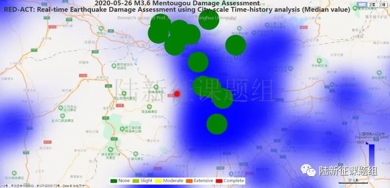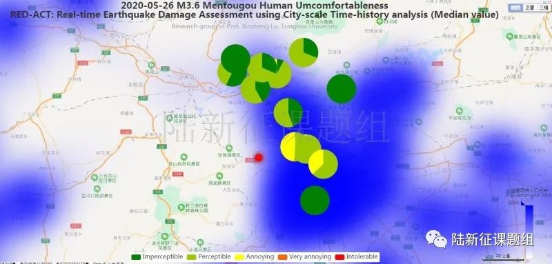 利用密布強震臺網在震后獲取的實時地震動信息,再結合城市抗震彈塑性分析,就可以得到地震發生后不同地點的建筑破壞情況,為抗震救災決策提供科學支撐。圖3為根據20200526北京門頭溝區3.6級地震震中附近范圍內臺站記錄分析得到的建筑震害分布示意圖。圖4為根據20200526北京門頭溝區3.6級地震震中附近范圍內臺站記錄分析得到的人員加速度感受分布示意圖。