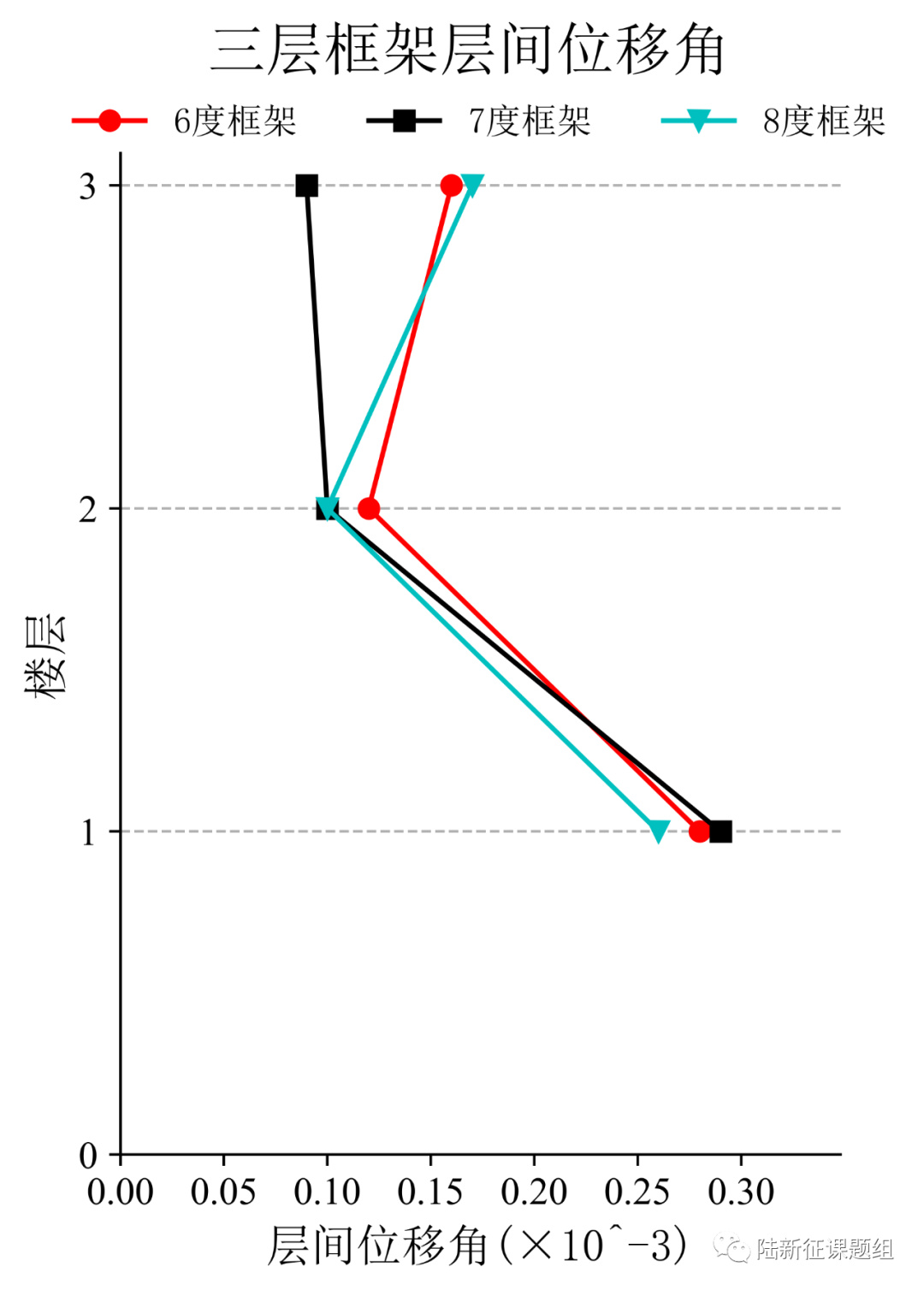 將典型臺站記錄輸入立面布置如圖6 (a)所示的6度、7度和8度設防的典型三層鋼筋混凝土框架結構,得到其層間位移角包絡如圖6 (b)所示。