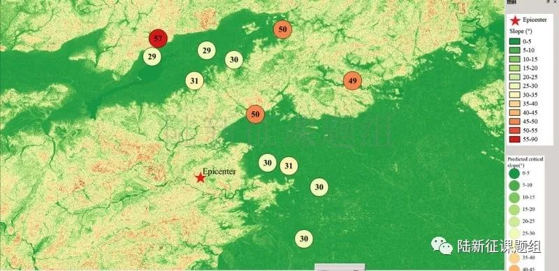 根據當地地形數據、巖性數據和實測地面運動記錄,可以計算得到不同滑坡體飽和比例下的滑坡分布,如圖5所示。其中,底圖為當地坡度分布圖,每個圓圈代表每個臺站的計算結果,圓圈中的數字代表發生滑坡的臨界坡度,臺站附近坡度大于該數值的地方滑坡發生概率高。