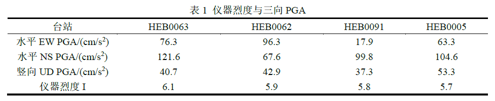 圖4為中國地震臺網中心在震后快速自動生成的儀器烈度圖。其中,最高儀器烈度為6.1度,其余臺站均低于6度。表1給出了4個典型臺站的儀器烈度和三向PGA,圖5給出了對應臺站的反應譜,臺站的大致位置標注于圖3中。典型臺站的儀器烈度均接近6度,說明本次地震會對這些臺站周圍的建筑造成一定破壞。對比圖3和圖4可以發現,5度區內的臺站儀器烈度基本上都在5.5度以上,說明儀器烈度能夠為震害評估提供合理參考。