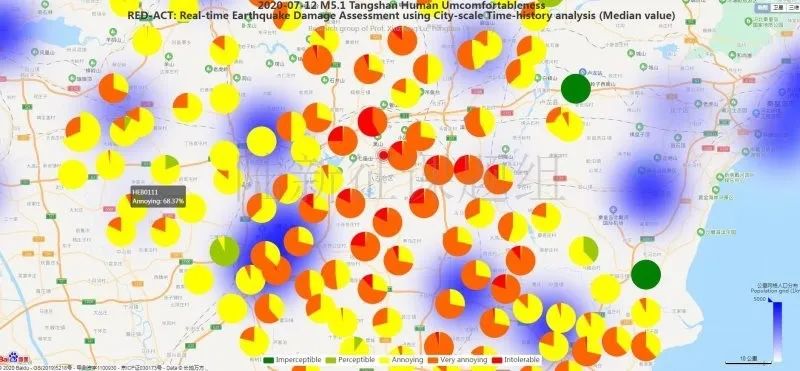 據中國地震臺網正式測定,7月12日6時38分在河北唐山市古冶區發生5.1級地震,震源深度10千米,震中位于北緯39.78度,東經118.44度。RED-ACT系統在當日7點50分完成了本次地震的破壞力分析,如圖1所示。