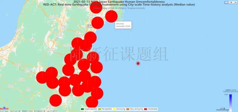圖4 20210213日本福島縣7.1級地震不同臺站地震記錄破壞力分布圖