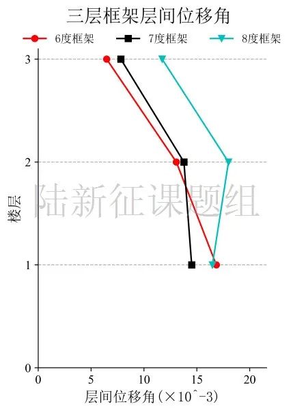 將典型臺站記錄輸入立面布置如圖7 (a)所示的6度、7度和8度設防的典型三層鋼筋混凝土框架結(jié)構(gòu),得到其層間位移角包絡如圖7 (b)所示。