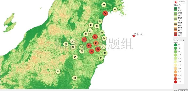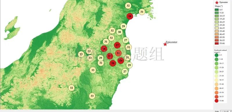 根據(jù)當?shù)氐匦螖?shù)據(jù)、巖性數(shù)據(jù)和實測地面運動記錄,可以計算得到不同滑坡體飽和比例下的滑坡分布,如圖6所示。其中,底圖為當?shù)仄露确植紙D,每個圓圈代表每個臺站的計算結(jié)果,圓圈中的數(shù)字代表發(fā)生滑坡的臨界坡度,臺站附近坡度大于該數(shù)值的地方滑坡發(fā)生概率高。