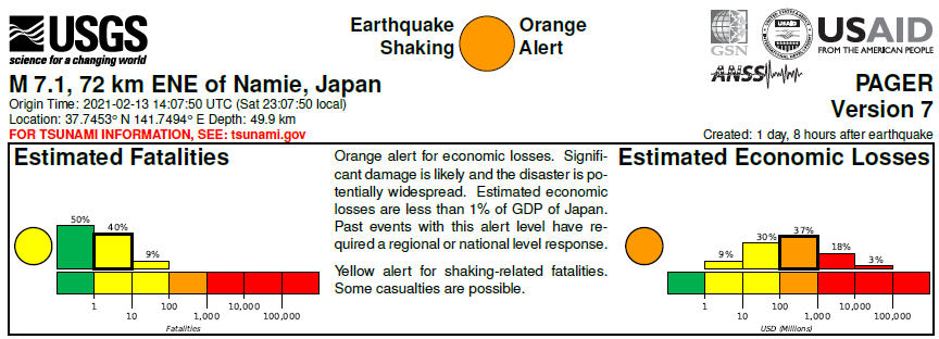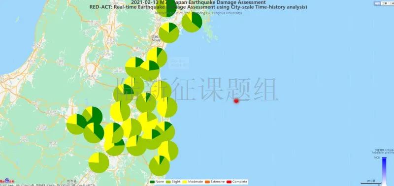 2021年2月13日22時(shí)08分在日本福島縣東部海域發(fā)生7.1級(jí)地震,震源深度60千米,后更正為7.3級(jí),震源深度55千米。地震發(fā)生后,RED-ACT系統(tǒng)很快給出了破壞力評(píng)估報(bào)告(詳見RED-ACT: 2月13日日本福島縣7.1級(jí)地震破壞力分析),如圖1所示。