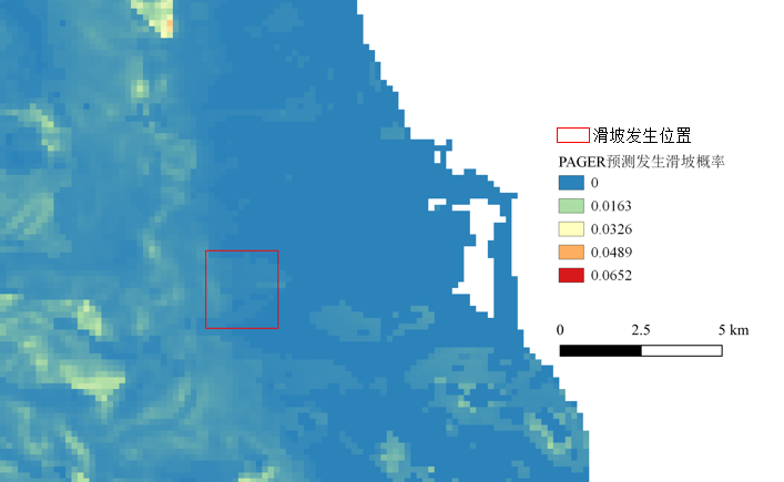 RED-ACT系統(tǒng)對重點(diǎn)區(qū)域的分析結(jié)果如圖7所示,可見該區(qū)域附近存在發(fā)生滑坡的高風(fēng)險(xiǎn)區(qū)(坡度高于滑坡臨界坡度處),其中紅框內(nèi)為滑坡實(shí)際發(fā)生地點(diǎn)(相馬市常磐高速公路)??梢奟ED-ACT系統(tǒng)有助于判斷滑坡高風(fēng)險(xiǎn)區(qū)。而PAGER分析結(jié)果表明該區(qū)域發(fā)生滑坡的概率非常低(圖8)。