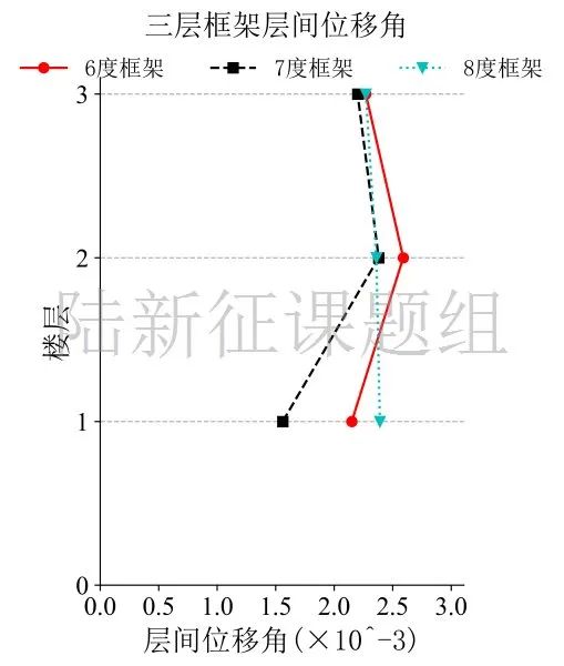 將典型臺站記錄輸入立面布置如圖7 (a)所示的6度、7度和8度設防的典型三層鋼筋混凝土框架結構,得到其層間位移角包絡如圖7 (b)所示。
