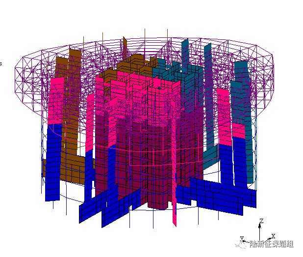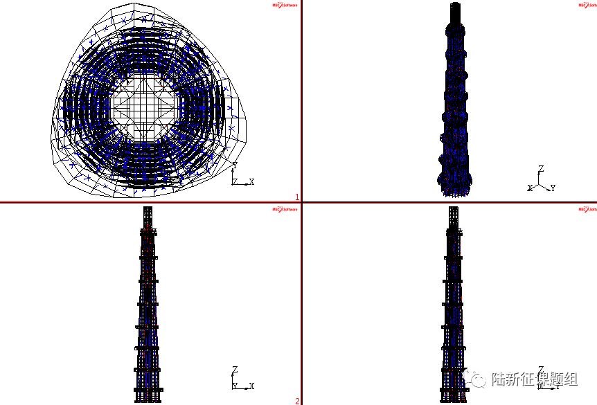 具體有限元建模策略為“以非線性計(jì)算性能良好的大型通用有限元程序MSC.Marc 2007為平臺(tái),建立了該超高層建筑的有限元模型。模型中包含的主要單元類型如下:空間梁?jiǎn)卧M外圍次框架、桁架和塔冠等型鋼構(gòu)件以及剪力墻邊緣構(gòu)件中的型鋼;分層殼單元模擬核心筒中的剪力墻和連梁;空間桿單元模擬連梁上下鐵的縱向鋼筋;膜單元模擬樓板;空間桿單元和分層殼組成的組合模型模擬巨型鋼骨混凝土柱。”(詳見《工程地震災(zāi)變模擬:從高層建筑到城市區(qū)域》,科學(xué)出版社,2015)。