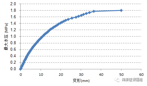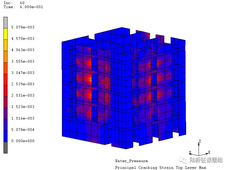 逐步增加電梯筒外的水壓力,看看電梯筒到底能抵抗多大的水壓。結(jié)果表明,當(dāng)最大水壓力達(dá)到1.8MPa(大概是180m水頭高度)時(shí),電梯筒就已經(jīng)達(dá)到強(qiáng)度極限,再也頂不住了(圖5)。另外在這樣的壓力下,電梯筒混凝土已經(jīng)嚴(yán)重開裂(圖6),實(shí)際上也無法保證密閉阻水了。所以,上海中心的電梯筒是無法抵抗400m的水壓力的。