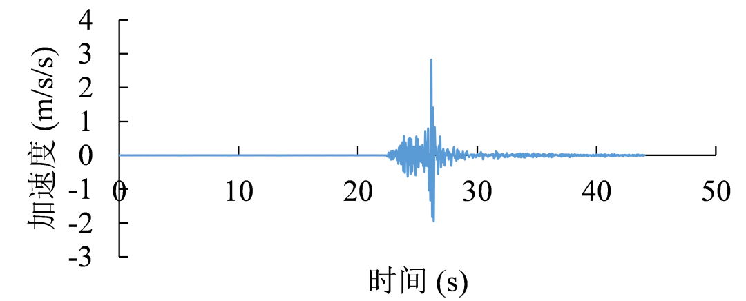 2020年5月18日云南昭通市巧家縣5.0級地震共獲得83組地震動,地震動記錄信息如表1所示。典型地震記錄(PGA最大)分析如下:編號為1的記錄臺站位置為北緯27.23度,東經103.20度,記錄到水平向PGA為2.82 m/s2,豎直向PGA為3.16 m/s2。該地震動及反應譜如圖2所示。