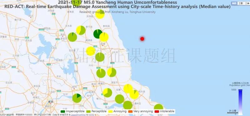圖5 20211117江蘇鹽城市大豐區(qū)海域5.0級地震不同臺站地震記錄人員加速度感受分布圖