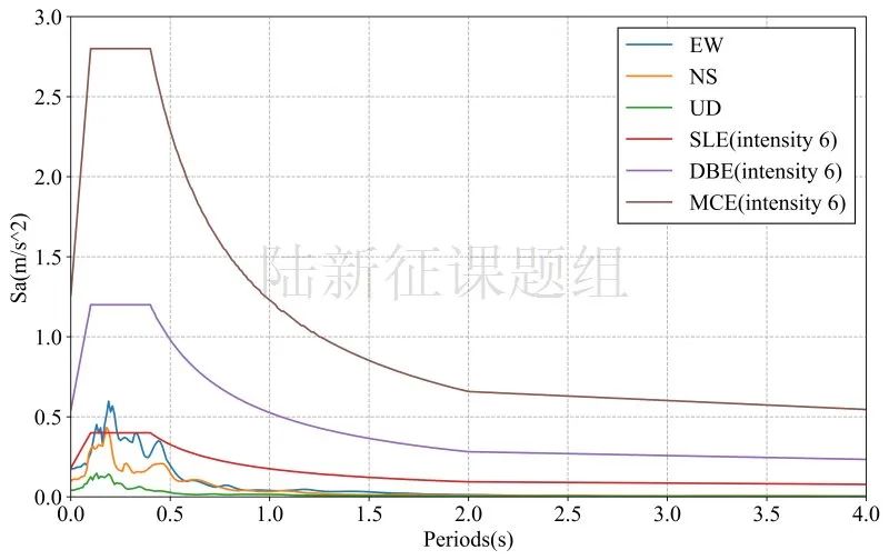 JSF0003典型臺站位置北緯32.4度,東經(jīng)120.82度(圖1,其中紅色標記為震中位置),記錄到水平向地震動峰值加速度為17.34cm/s/s,豎直向地震動峰值加速度為3.97cm/s/s。該地震動及反應譜如圖2、圖3所示。