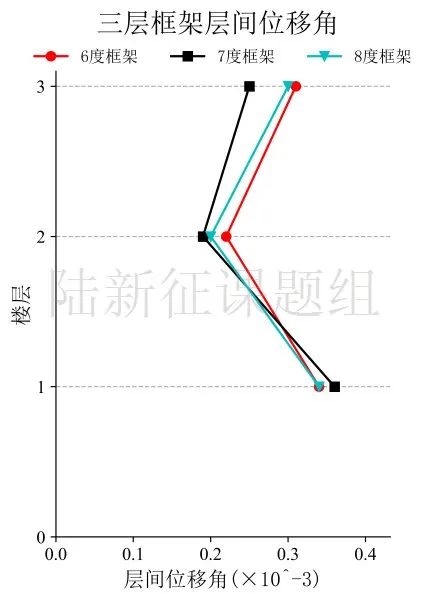 將典型臺站記錄輸入立面布置如圖7(a)所示的6度、7度和8度設防的典型三層鋼筋混凝土框架結(jié)構(gòu),得到其層間位移角包絡如圖7(b)所示。