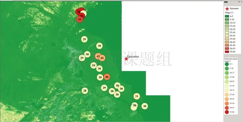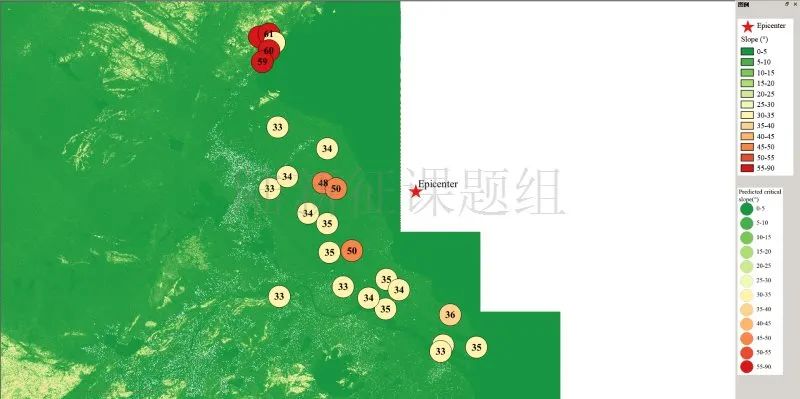 根據(jù)當?shù)氐匦螖?shù)據(jù)、巖性數(shù)據(jù)和實測地面運動記錄,可以計算得到不同滑坡體飽和比例下的滑坡分布,如圖6所示。其中,底圖為當?shù)仄露确植紙D,每個圓圈代表每個臺站的計算結(jié)果,圓圈中的數(shù)字代表發(fā)生滑坡的臨界坡度,臺站附近坡度大于該數(shù)值的地方滑坡發(fā)生概率高。