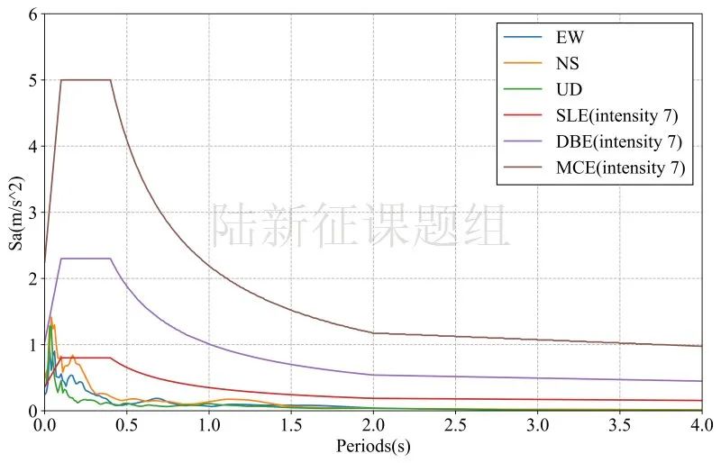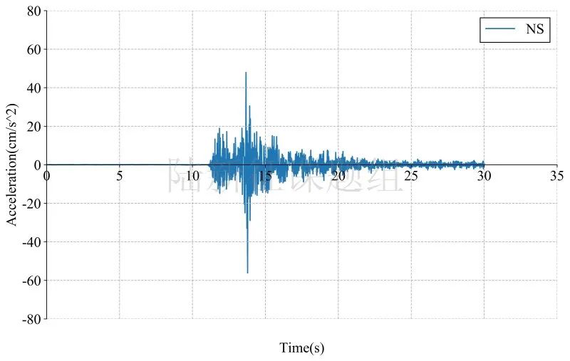 QHC0028典型臺站位置北緯37.71度,東經101.31度(圖1,其中紅色標記為震中位置),記錄到水平向地震動峰值加速度為56.17cm/s/s,豎直向地震動峰值加速度為36.61cm/s/s。該地震動及反應譜如圖2、圖3所示。