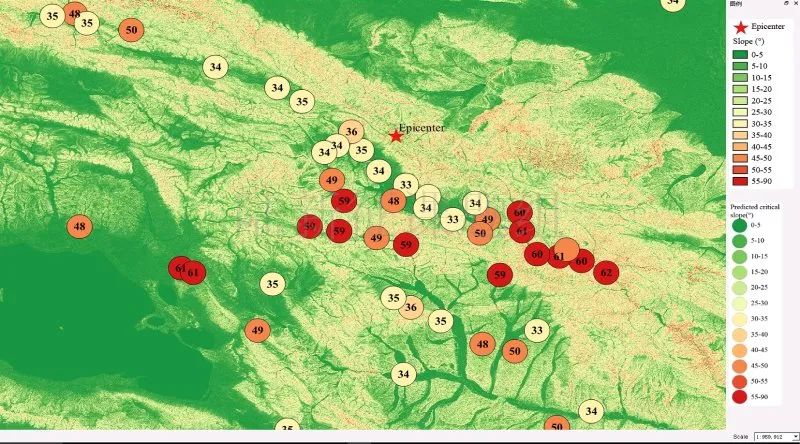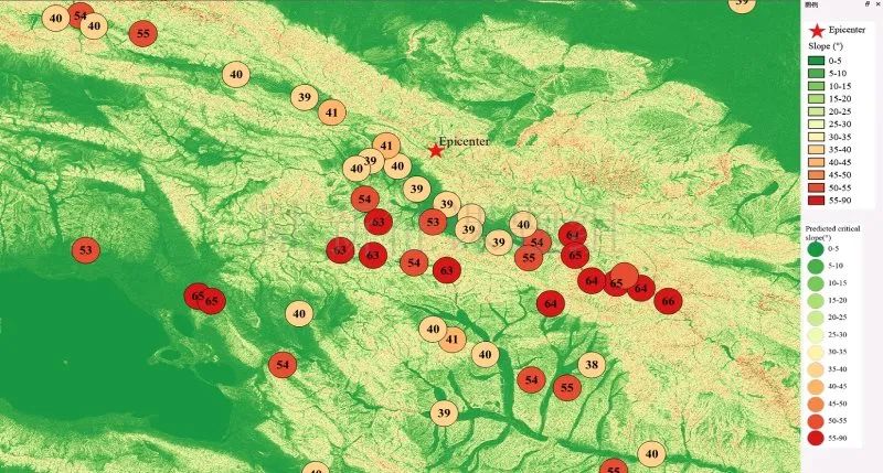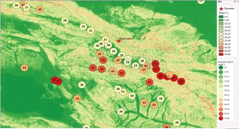 根據當地地形數據、巖性數據和實測地面運動記錄,可以計算得到不同滑坡體飽和比例下的滑坡分布,如圖6所示。其中,底圖為當地坡度分布圖,每個圓圈代表每個臺站的計算結果,圓圈中的數字代表發(fā)生滑坡的臨界坡度,臺站附近坡度大于該數值的地方滑坡發(fā)生概率高。