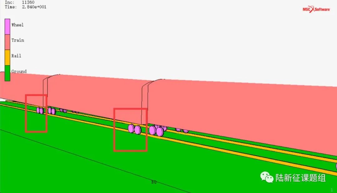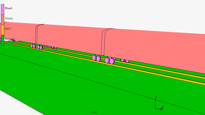 根據資料,列車并非在高速運行時發生了脫軌,而是在“幾乎停止”的情況下發生了脫軌。因此本文為了簡化起見,計算列車在靜止狀態下受地震作用的響應。本文基于MSC.MARC通用有限元軟件,建立了一個簡化的列車模型(圖2),在列車靜止狀態開始動力工況模擬。