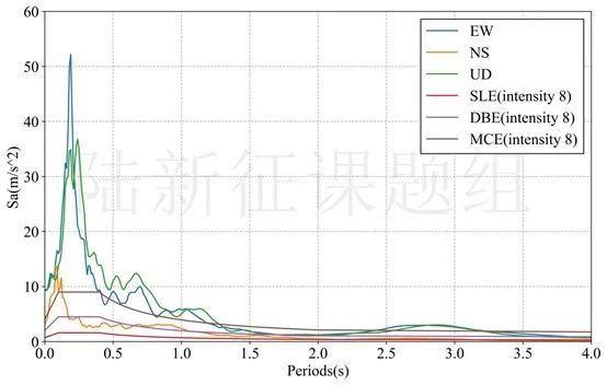 輸入的地震動為本次地震記錄到的MYGH10地震動,其X、Y、Z三個方向的加速度時程及反應譜如圖3所示。