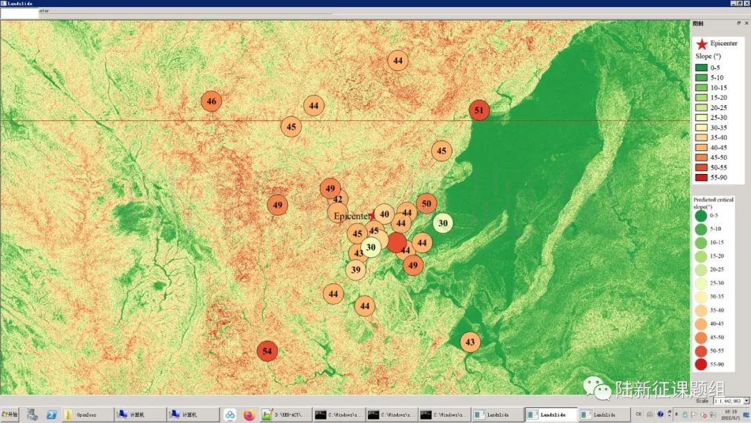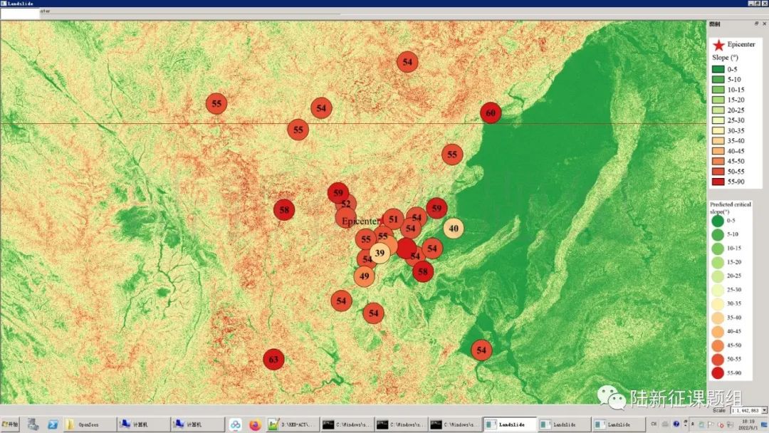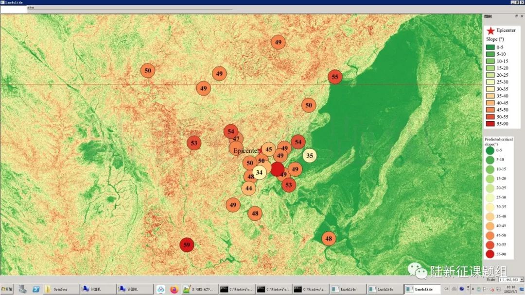 根據當地地形數據、巖性數據和實測地面運動記錄,可以計算得到不同滑坡體飽和比例下的滑坡分布,如圖5所示。其中,底圖為當地坡度分布圖,每個圓圈代表每個臺站的計算結果,圓圈中的數字代表發生滑坡的臨界坡度,臺站附近坡度大于該數值的地方滑坡發生概率高。