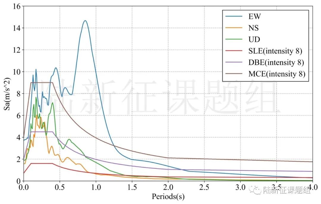 SC.T2601典型臺站位置北緯30.38度,東經103.01度,記錄到水平向地震動峰值加速度為377cm/s/s,豎直向地震動峰值加速度為189cm/s/s。該地震動及反應譜如圖1、圖2所示。另外SC.T2671記錄到1282cm/s/s的加速度,但是中長周期反應譜強度不及SC.T2601。