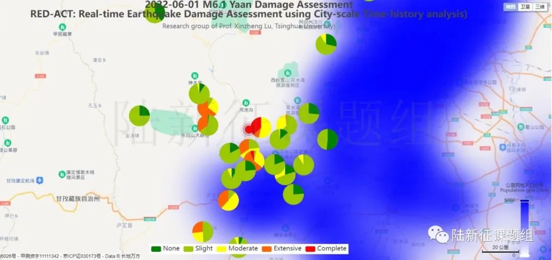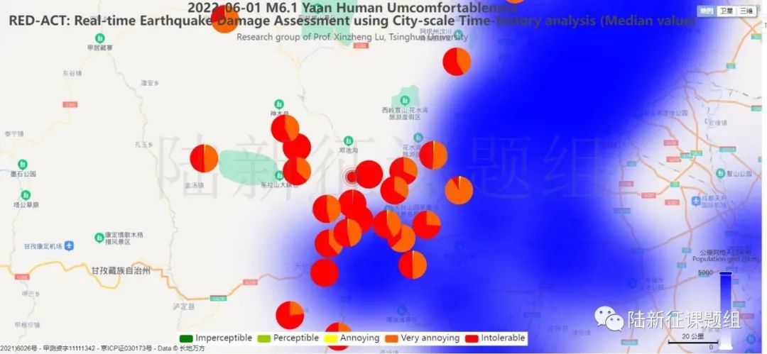 根據中國地震學會標準《基于強震動記錄的地震破壞力評估T/SSC 1—2021》(參閱新標準發布 :基于強震動記錄的地震破壞力評估),利用密布強震臺網在震后獲取的實時地震動信息,再結合城市抗震彈塑性分析,就可以得到地震發生后不同地點的建筑破壞情況,為抗震救災決策提供科學支撐。圖3為根據本次地震震中附近范圍內臺站記錄分析得到的建筑震害分布示意圖。圖4為根據本次地震震中附近范圍內臺站記錄分析得到的人員加速度感受分布示意圖。