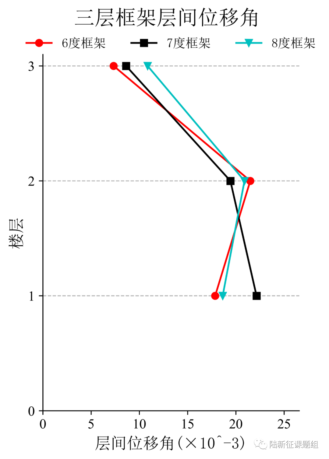 將典型臺站記錄輸入立面布置如圖6(a)所示的6度、7度和8度設防的典型三層鋼筋混凝土框架結構,得到其層間位移角包絡如圖6(b)所示。