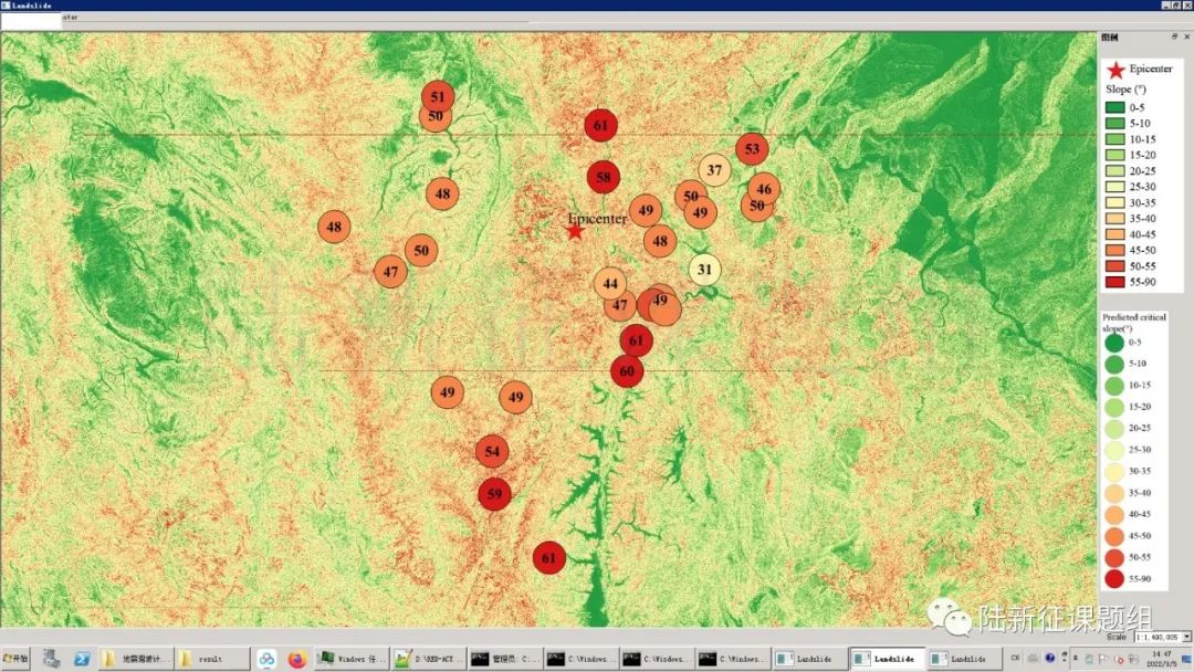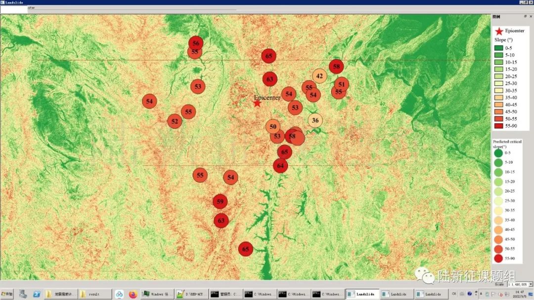根據(jù)當(dāng)?shù)氐匦螖?shù)據(jù)、巖性數(shù)據(jù)和實(shí)測(cè)地面運(yùn)動(dòng)記錄,可以計(jì)算得到不同滑坡體飽和比例下的滑坡分布,如圖5所示。其中,底圖為當(dāng)?shù)仄露确植紙D,每個(gè)圓圈代表每個(gè)臺(tái)站的計(jì)算結(jié)果,圓圈中的數(shù)字代表發(fā)生滑坡的臨界坡度,臺(tái)站附近坡度大于該數(shù)值的地方滑坡發(fā)生概率高。