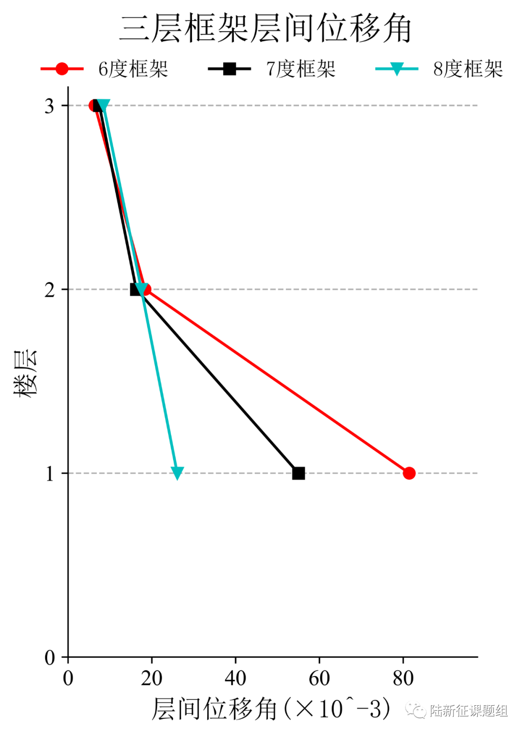 將ECS臺站記錄輸入立面布置如圖4(a)所示的6度、7度和8度設(shè)防的典型三層鋼筋混凝土框架結(jié)構(gòu),得到其層間位移角包絡(luò)如圖4(b)所示。