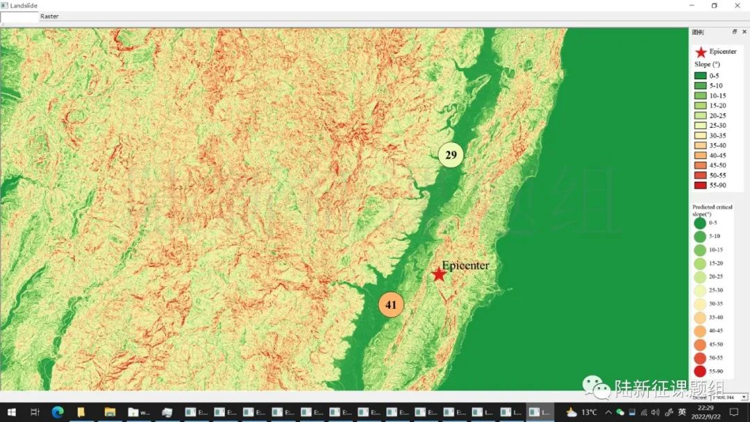 分析結(jié)果認(rèn)為在震中附近30-40度以上坡度地區(qū)就可能發(fā)生滑坡,而震中附近地形又很復(fù)雜,因此滑坡的風(fēng)險很高。這與本次花蓮地震實際震害情況相符。