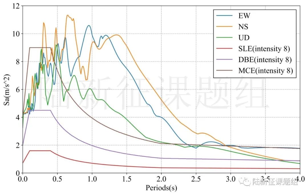 每次地震發(fā)生后,我們研究各種各樣的震害總有一種霧里看花的感覺,好像是這樣,又好像有些問題沒有搞清楚。但是自從有了詳細的地面運動記錄后,很多問題就變得容易理解多了。從圖1中不難看出,雖然兩次地震的震級很相近,但是實際地震動的波形和反應譜形狀卻差別非常顯著。對比T2271臺站和EYUL臺站記錄可以看出,EYUL臺站作為本次花蓮6.9級地震記錄到的最大地面加速度記錄,其地面運動的峰值、持時,包括大部分周期段的反應譜值,都顯著低于T2271臺站記錄。更值得研究的是對比T2271臺站和ECS臺站,雖然ECS臺站的地面峰值加速度不是很大,但是其1s左右周期段的反應譜值非常高。因此,其對中長周期的結構破壞力尤其突出。如果我們將ECS臺站地震動的反應譜和《建筑抗震設計規(guī)范》GB50011的8度反應譜放在一起對比(圖2),就可以看到ECS臺站記錄在1s周期左右的反應譜值顯著高于8度罕遇地震反應譜(高了約2.5倍)。這種地震可能會給中等周期結構(多層、小高層建筑,常規(guī)橋梁等)造成非常嚴重的破壞。