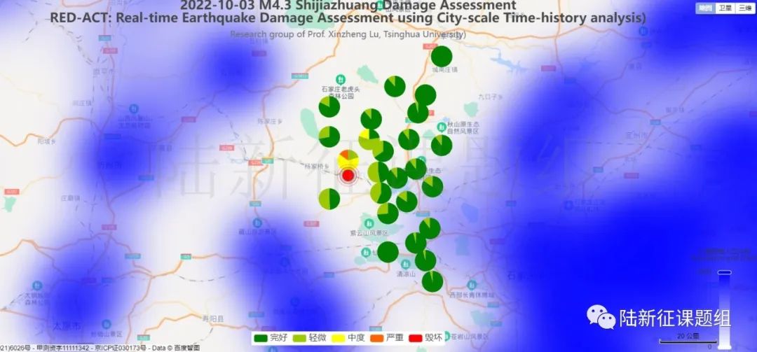 根據中國地震學會標準《基于強震動記錄的地震破壞力評估T/SSC 1—2021》(參閱新標準發布 :基于強震動記錄的地震破壞力評估),利用密布強震臺網在震后獲取的實時地震動信息,再結合城市抗震彈塑性分析,就可以得到地震發生后不同地點的建筑破壞情況,為抗震救災決策提供科學支撐。圖3為根據本次地震震中附近范圍內臺站記錄分析得到的建筑震害分布示意圖。圖4為根據本次地震震中附近范圍內臺站記錄分析得到的人員加速度感受分布示意圖。