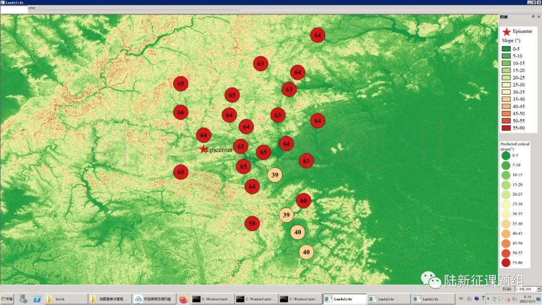 根據當地地形數據、巖性數據和實測地面運動記錄,可以計算得到不同滑坡體飽和比例下的滑坡分布,如圖5所示。其中,底圖為當地坡度分布圖,每個圓圈代表每個臺站的計算結果,圓圈中的數字代表發生滑坡的臨界坡度,臺站附近坡度大于該數值的地方滑坡發生概率高。