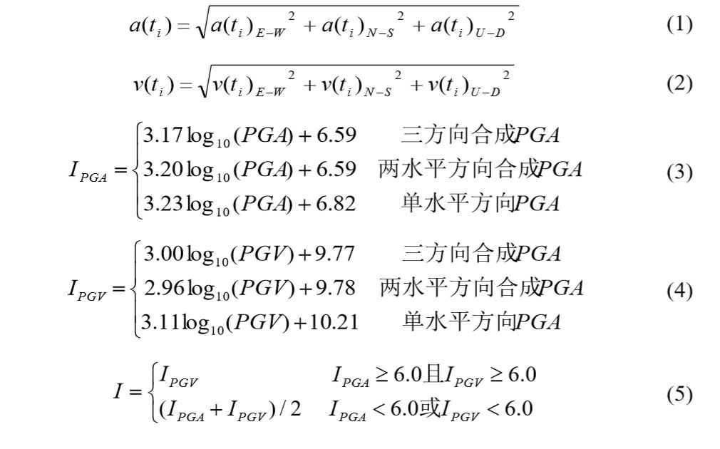 首先根據式(1)、(2)將三個方向的地震動進行合成得到合成地震動的PGA和PGV,接著根據式(3)、(4)和(5)推算得到儀器烈度I、IPGA和IPGV(中國地震局監測預報司, 2015)。