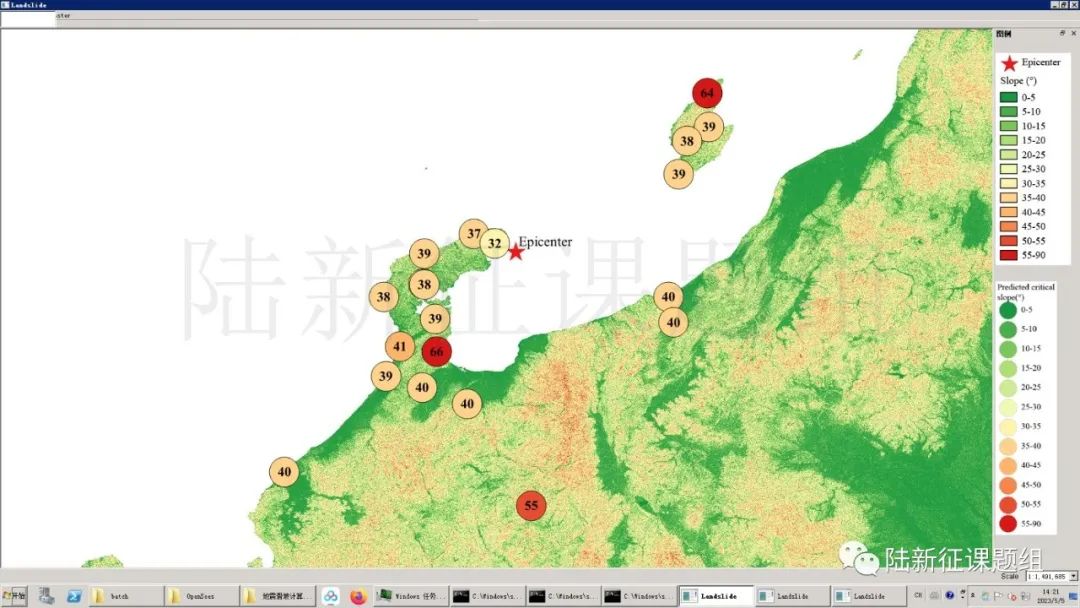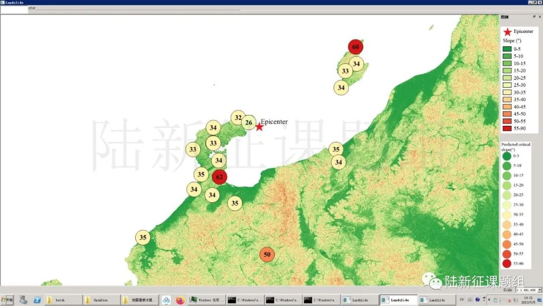 根據當地地形數據、巖性數據和實測地面運動記錄,可以計算得到不同滑坡體飽和比例下的滑坡分布,如圖5所示。其中,底圖為當地坡度分布圖,每個圓圈代表每個臺站的計算結果,圓圈中的數字代表發生滑坡的臨界坡度,臺站附近坡度大于該數值的地方滑坡發生概率高。