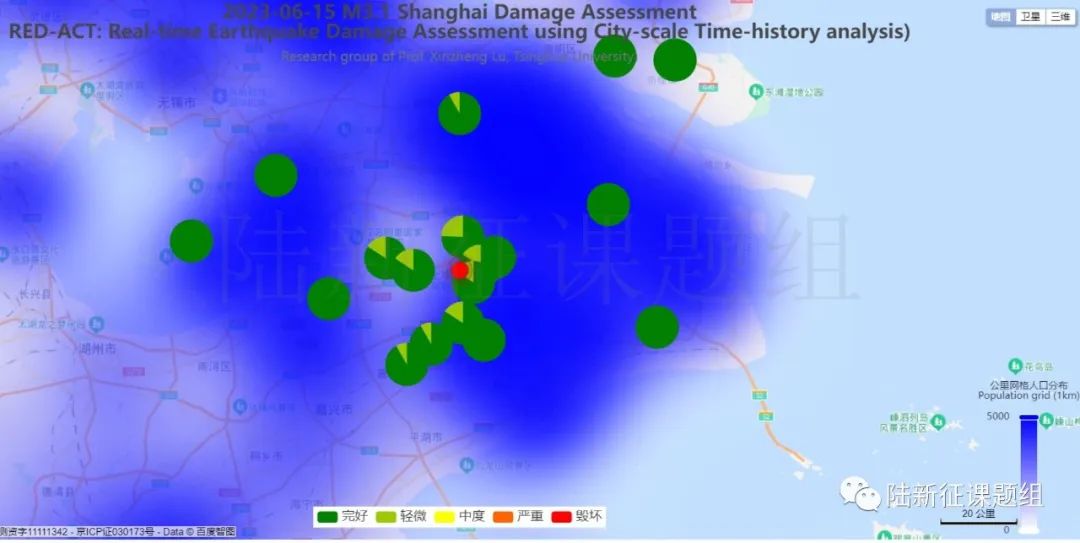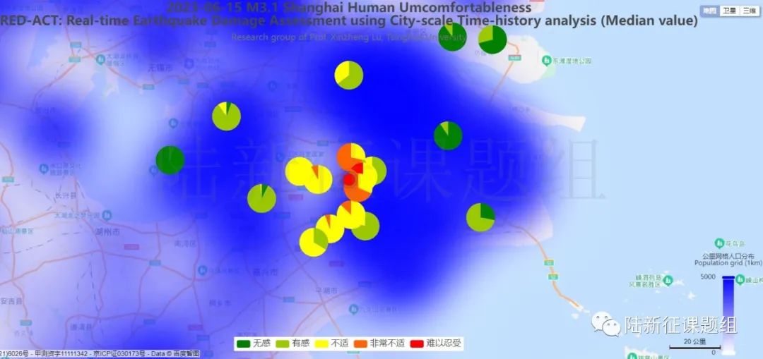 根據中國地震學會標準《基于強震動記錄的地震破壞力評估T/SSC 1—2021》(參閱新標準發布 :基于強震動記錄的地震破壞力評估),利用密布強震臺網在震后獲取的實時地震動信息,再結合城市抗震彈塑性分析,就可以得到地震發生后不同地點的建筑破壞情況,為抗震救災決策提供科學支撐。圖3為根據本次地震震中附近范圍內臺站記錄分析得到的建筑震害分布示意圖。圖4為根據本次地震震中附近范圍內臺站記錄分析得到的人員加速度感受分布示意圖。
