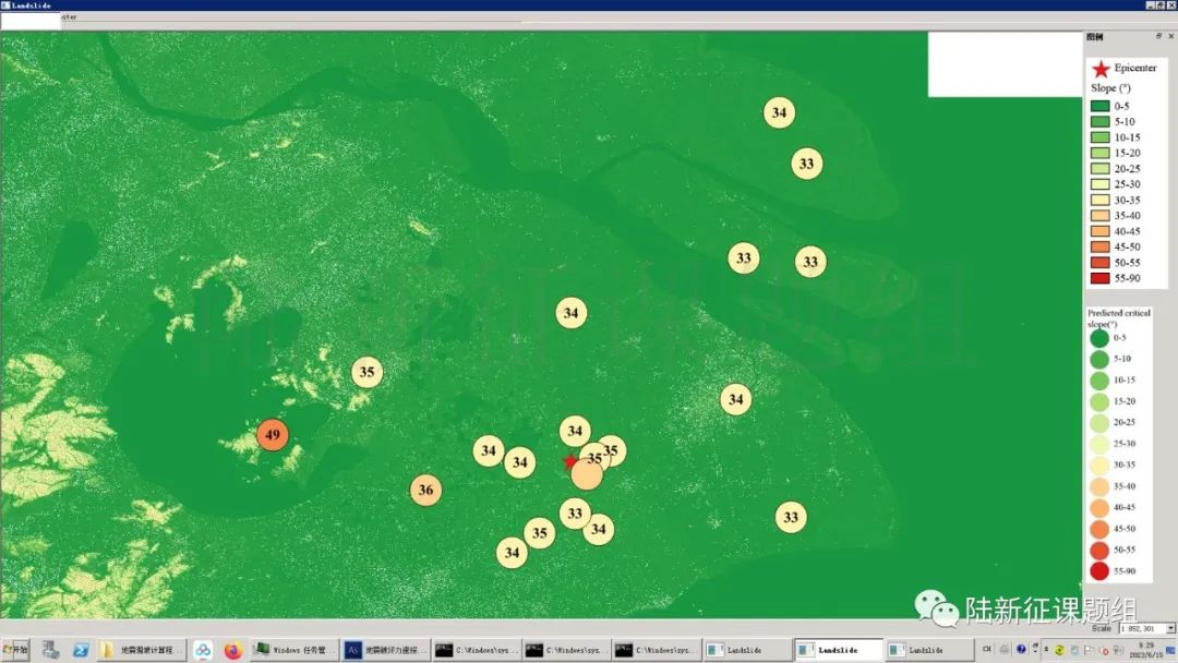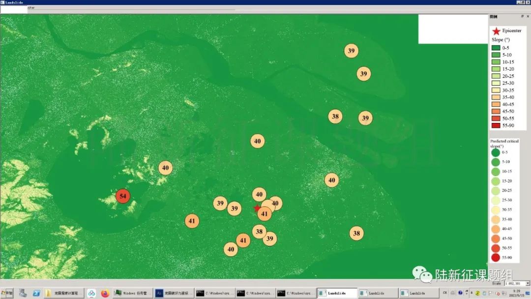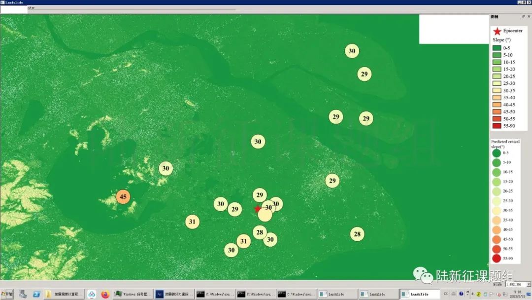 根據當地地形數據、巖性數據和實測地面運動記錄,可以計算得到不同滑坡體飽和比例下的滑坡分布,如圖5所示。其中,底圖為當地坡度分布圖,每個圓圈代表每個臺站的計算結果,圓圈中的數字代表發生滑坡的臨界坡度,臺站附近坡度大于該數值的地方滑坡發生概率高。