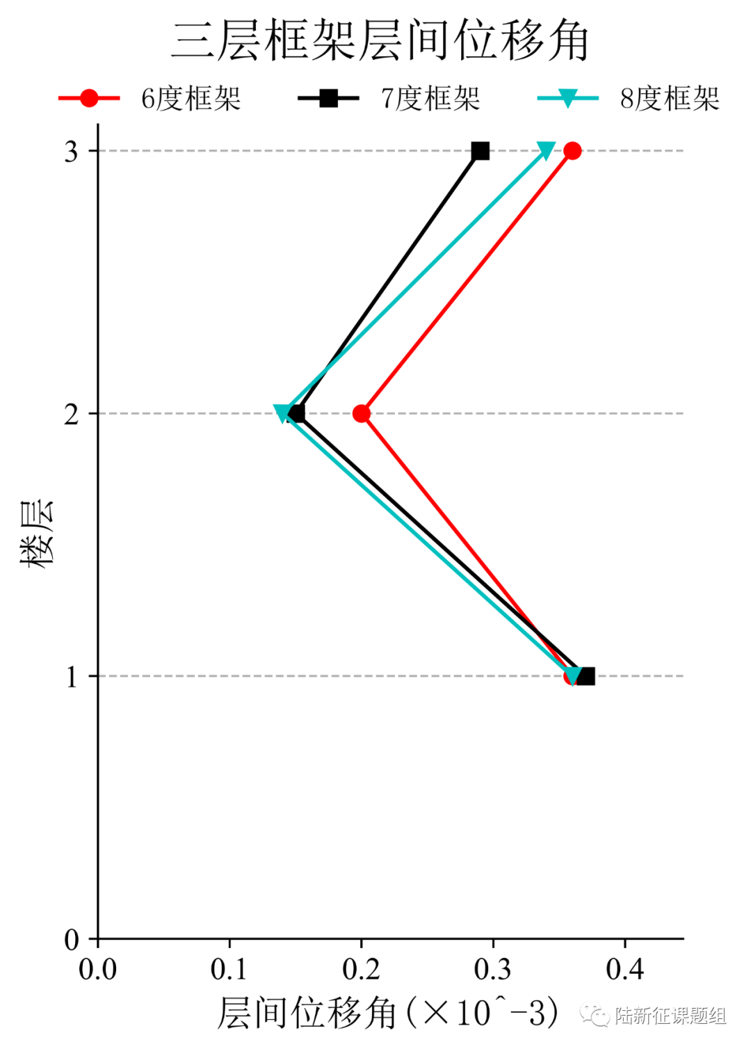 將典型臺站記錄輸入立面布置如圖6(a)所示的6度、7度和8度設防的典型三層鋼筋混凝土框架結構,得到其層間位移角包絡如圖6(b)所示。