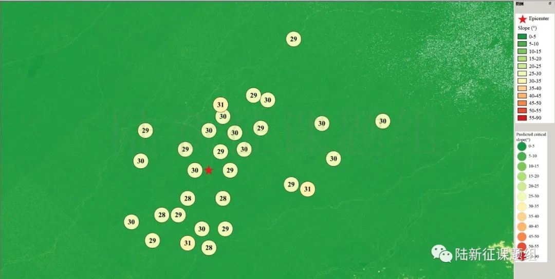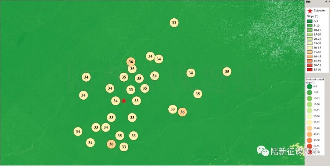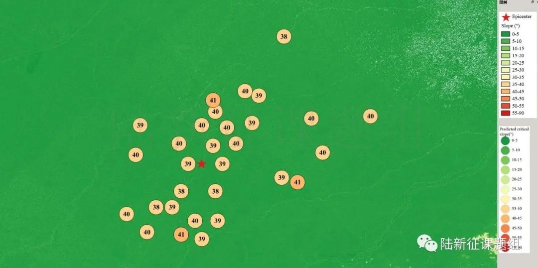 根據(jù)當(dāng)?shù)氐匦螖?shù)據(jù)、巖性數(shù)據(jù)和實測地面運動記錄,可以計算得到不同滑坡體飽和比例下的滑坡分布,如圖5所示。其中,底圖為當(dāng)?shù)仄露确植紙D,每個圓圈代表每個臺站的計算結(jié)果,圓圈中的數(shù)字代表發(fā)生滑坡的臨界坡度,臺站附近坡度大于該數(shù)值的地方滑坡發(fā)生概率高。