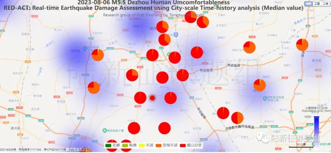 根據(jù)中國地震學(xué)會標(biāo)準(zhǔn)《基于強震動記錄的地震破壞力評估T/SSC 1—2021》(參閱新標(biāo)準(zhǔn)發(fā)布 :基于強震動記錄的地震破壞力評估),利用密布強震臺網(wǎng)在震后獲取的實時地震動信息,再結(jié)合城市抗震彈塑性分析,就可以得到地震發(fā)生后不同地點的建筑破壞情況,為抗震救災(zāi)決策提供科學(xué)支撐。圖3為根據(jù)本次地震震中附近范圍內(nèi)臺站記錄分析得到的建筑震害分布示意圖。圖4為根據(jù)本次地震震中附近范圍內(nèi)臺站記錄分析得到的人員加速度感受分布示意圖。