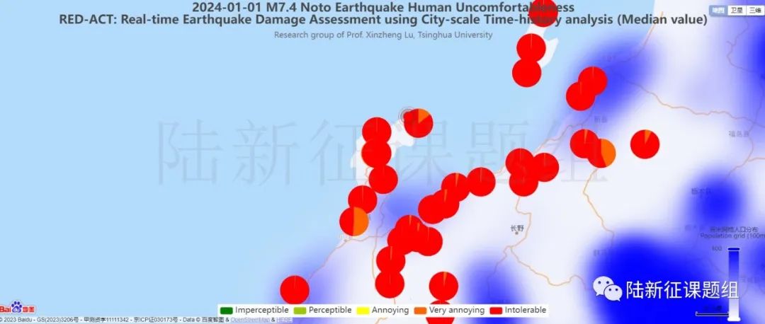 根據中國地震學會標準《基于強震動記錄的地震破壞力評估T/SSC 1—2021》(參閱新標準發布 :基于強震動記錄的地震破壞力評估),利用密布強震臺網在震后獲取的實時地震動信息,再結合城市抗震彈塑性分析,就可以得到地震發生后不同地點的建筑破壞情況,為抗震救災決策提供科學支撐。圖3為根據本次地震震中附近范圍內臺站記錄分析得到的建筑震害分布示意圖。圖4為根據本次地震震中附近范圍內臺站記錄分析得到的人員加速度感受分布示意圖。