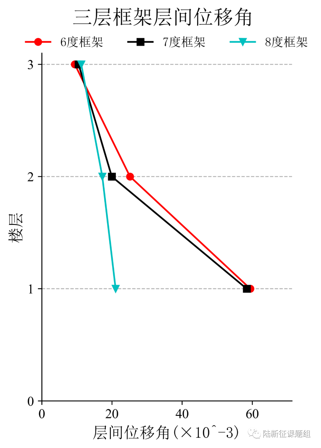 將典型臺站記錄輸入立面布置如圖6(a)所示的6度、7度和8度設防的典型三層鋼筋混凝土框架結構,得到其層間位移角包絡如圖6(b)所示。