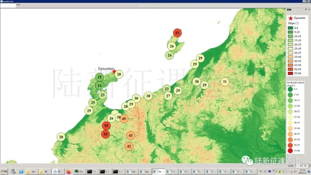 根據當地地形數據、巖性數據和實測地面運動記錄,可以計算得到不同滑坡體飽和比例下的滑坡分布,如圖5所示。其中,底圖為當地坡度分布圖,每個圓圈代表每個臺站的計算結果,圓圈中的數字代表發生滑坡的臨界坡度,臺站附近坡度大于該數值的地方滑坡發生概率高。